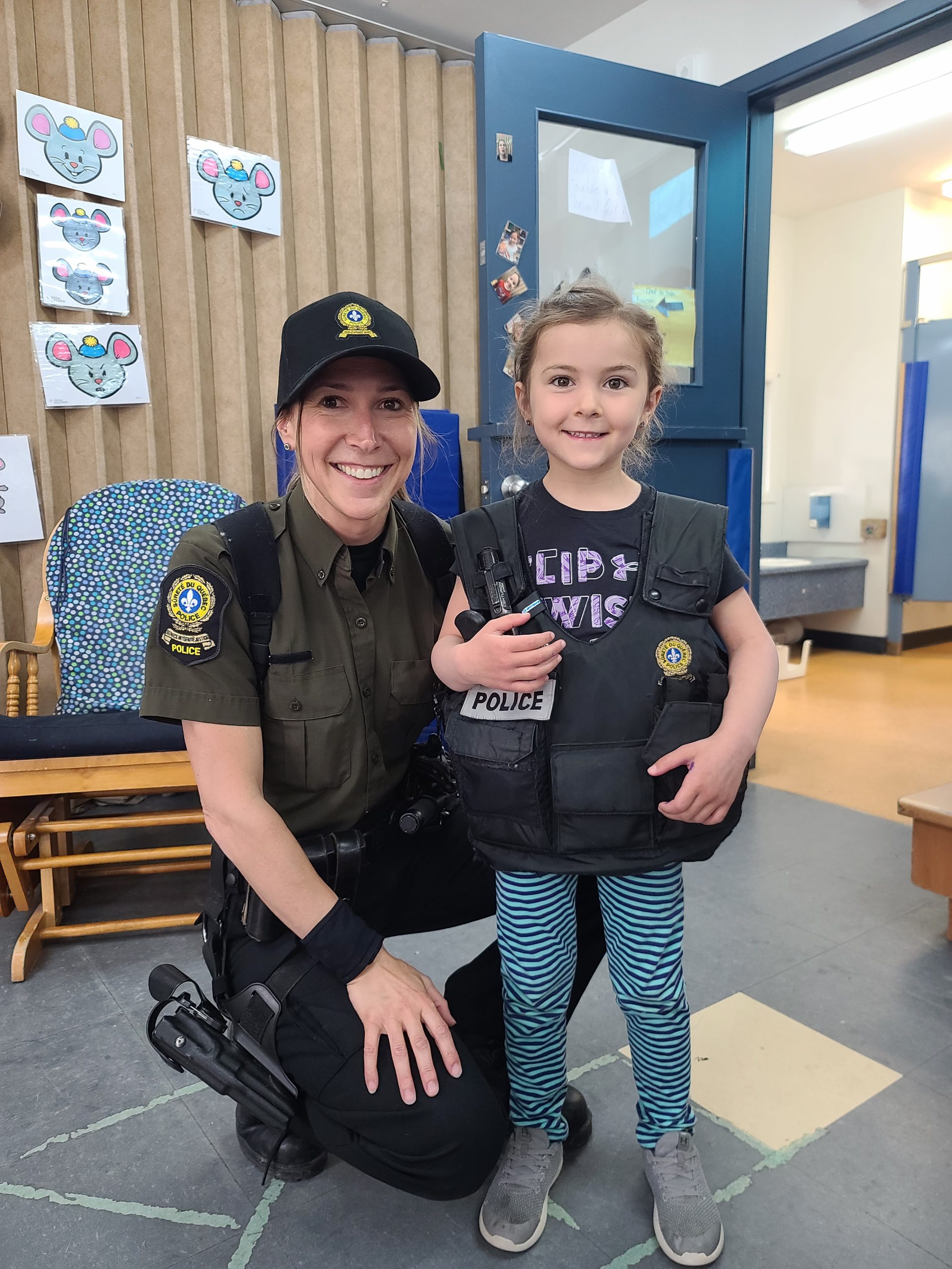 - Elle a également rencontré des élèves du préscolaire à l’école Laure-Gaudreault pour présentation du métier policier et conseils de sécurité en lien avec les inconnus.