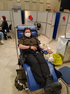 Puis, le 27 mai, les agentes Aubut et Bisson ainsi que le Sergent Couillard du poste de la MRC de La Jacques-Cartier se sont présentés au Mont-Saint-Sacrement, une école secondaire du territoire, pour faire un don de sang dans le cadre d’une collecte d’Héma-Québec.