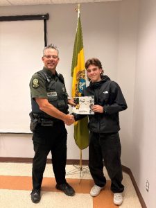 Le 25 octobre dernier, M. Alexis Lepage a été accueilli par l’équipe du Sergent Daniel Bérubé pour une journée dans le cadre du programme « Policier d’un jour ». Ce programme permet aux jeunes de se familiariser avec les différentes facettes du métier policier. Il sert de levier pour démystifier le travail du policier, promouvoir ses activités et susciter l’intérêt des jeunes pour la profession. Sur la photo, l’agent Éric Larouche lui remet un certificat de policier d’un Jour en reconnaissance de sa participation à cette expérience unique.