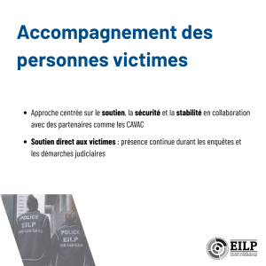 Des intervenant(e)s d’organismes crédibles comme les Centres d’aide aux victimes d’actes criminels (CAVAC) travaillent dans les mêmes bureaux que l’EILP.