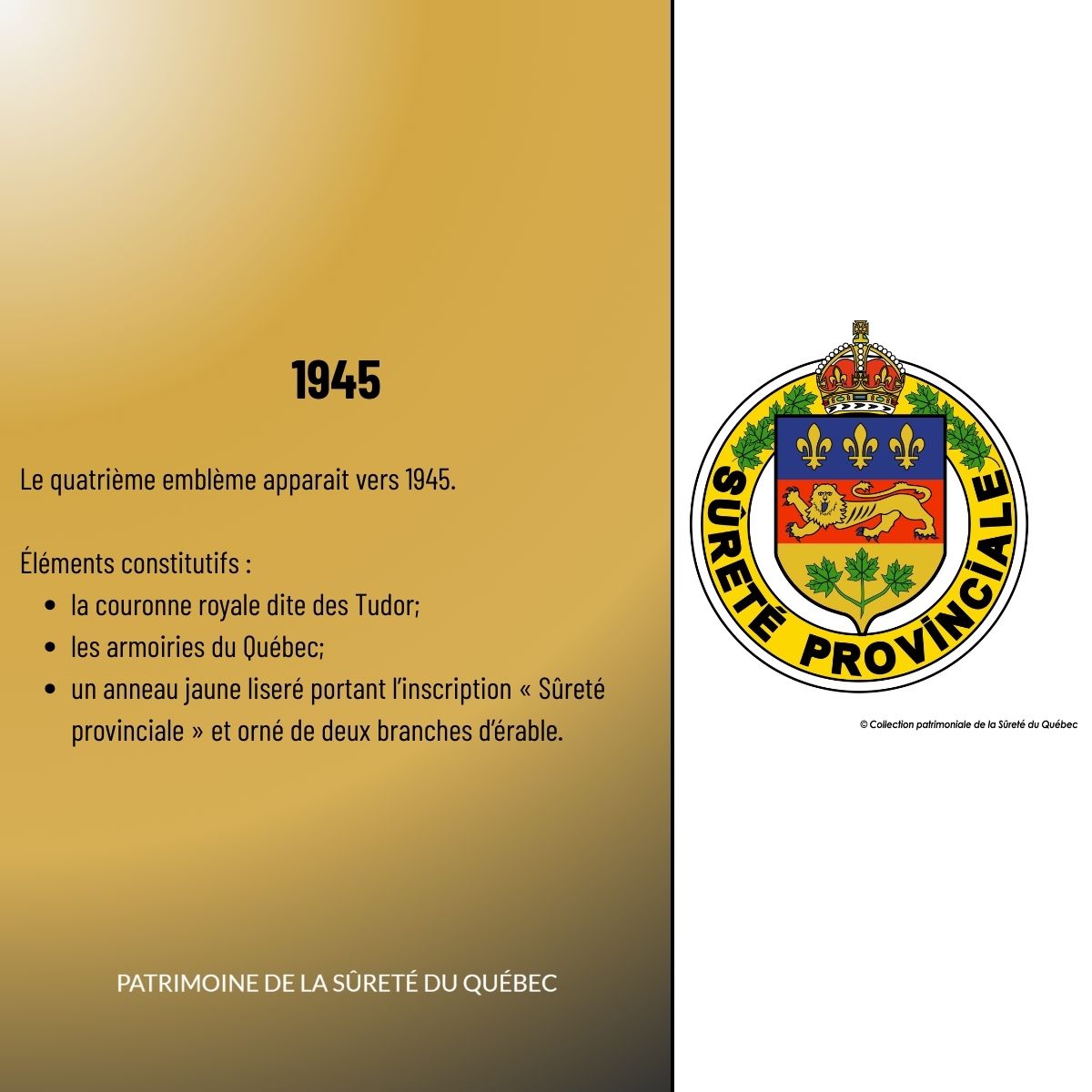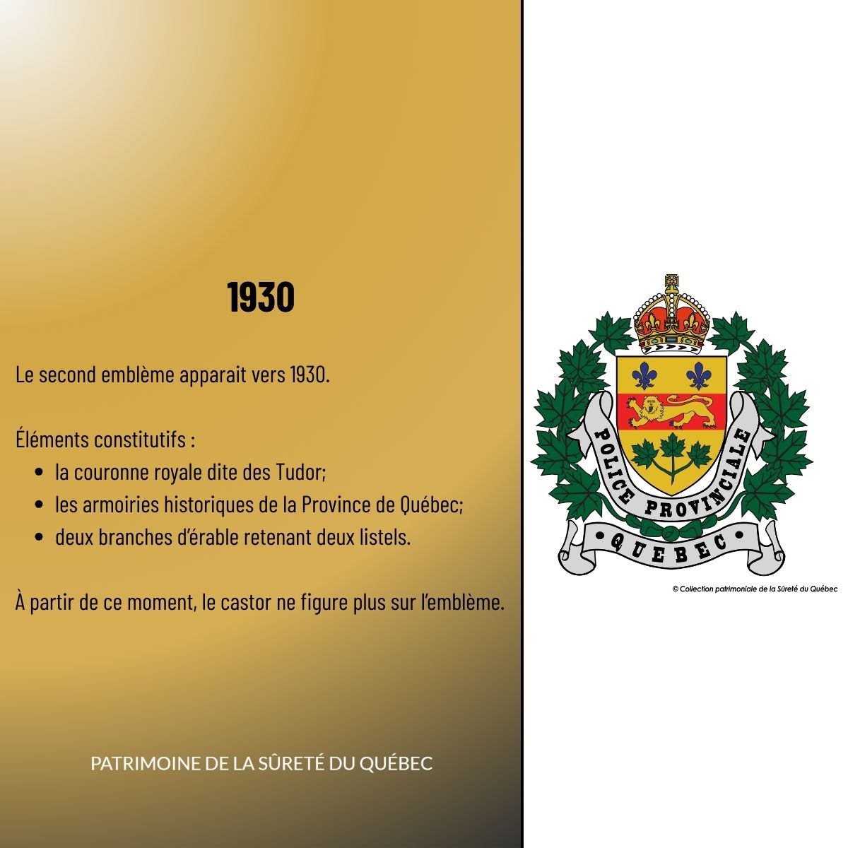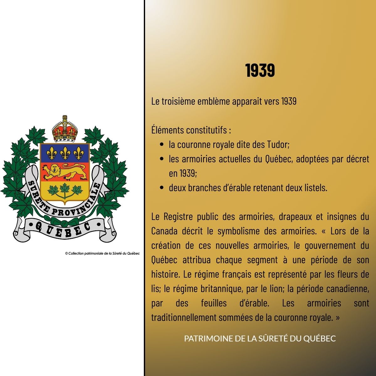 Par la suite, les emblèmes arborent la deuxième et actuelle version des armoiries du Québec, adoptées par décret du lieutenant-gouverneur du Québec en conseil le 7 décembre 1939. Cette dernière représentation héraldique est l’élément central des différents emblèmes de la Sûreté jusqu’au début des années 1970.