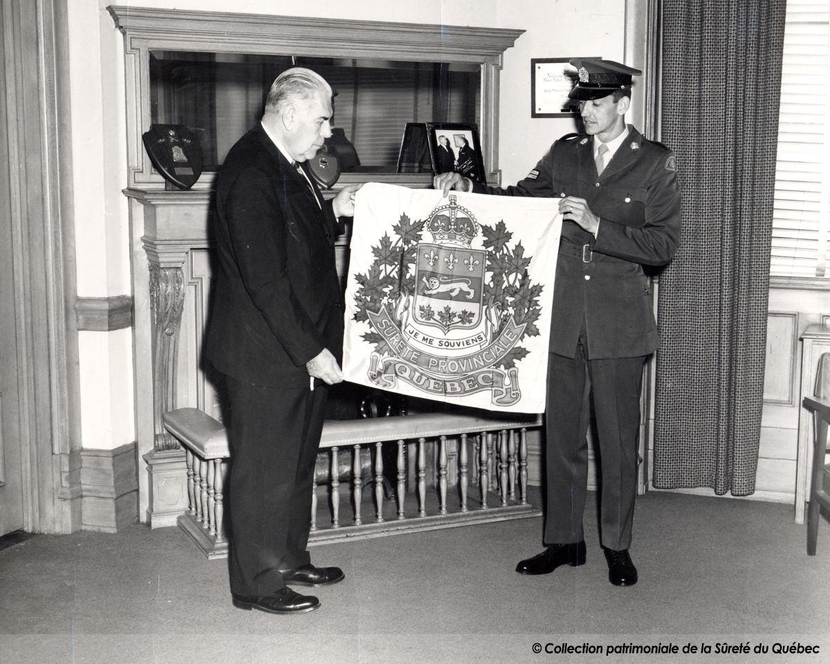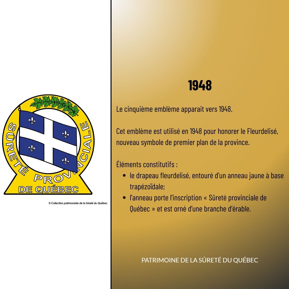Une seule exception confirme cette règle : 1948. C’est effectivement en 1948 que le gouvernement du Québec adopte son nouveau drapeau : le fleurdelisé. Pour l’occasion, un nouvel emblème, avec le fleurdelisé comme élément central, est créé pour le corps de police provincial. Mais rapidement, les armoiries du Québec reprennent leur place prédominante dans l’identification visuelle de l’organisation.