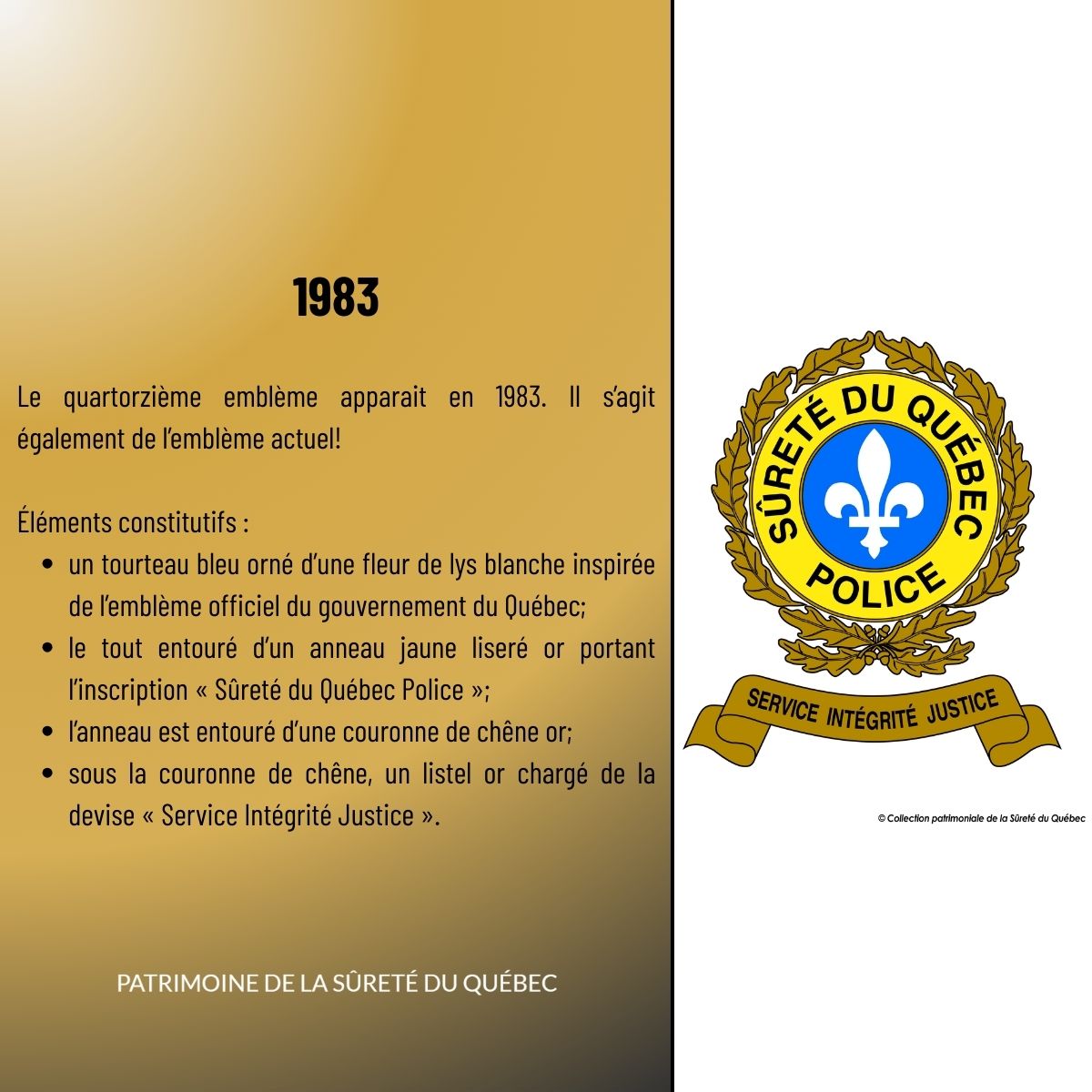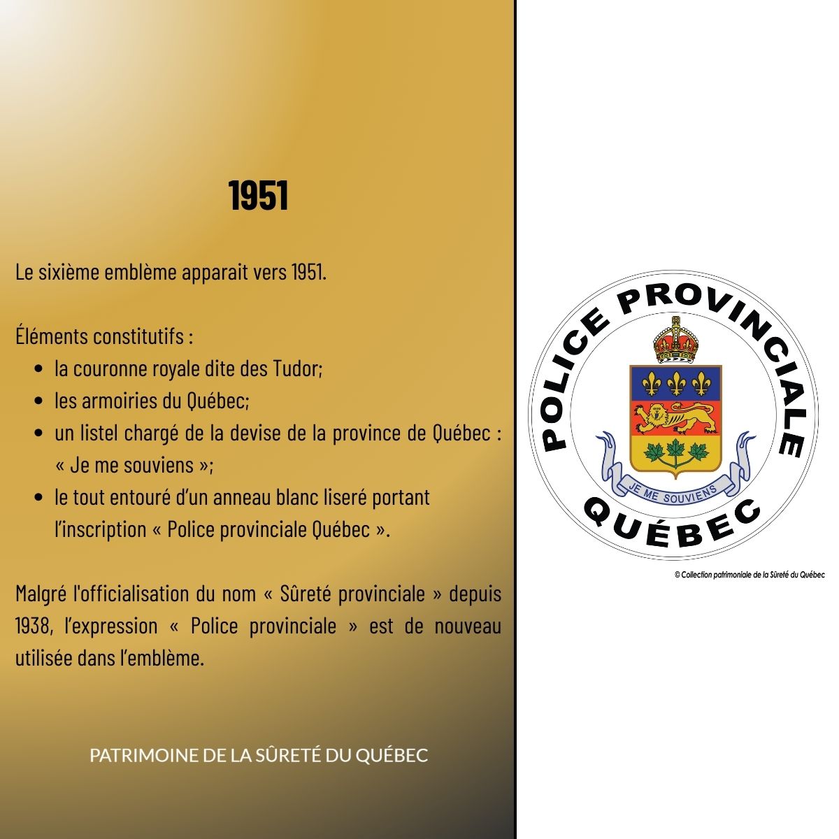Étroitement liée à l’histoire de la société québécoise, notamment à ses transformations sociales et culturelles, l’évolution de l’emblème de la SQ est parsemée de changements, tant dans sa forme que dans ses éléments constitutifs.