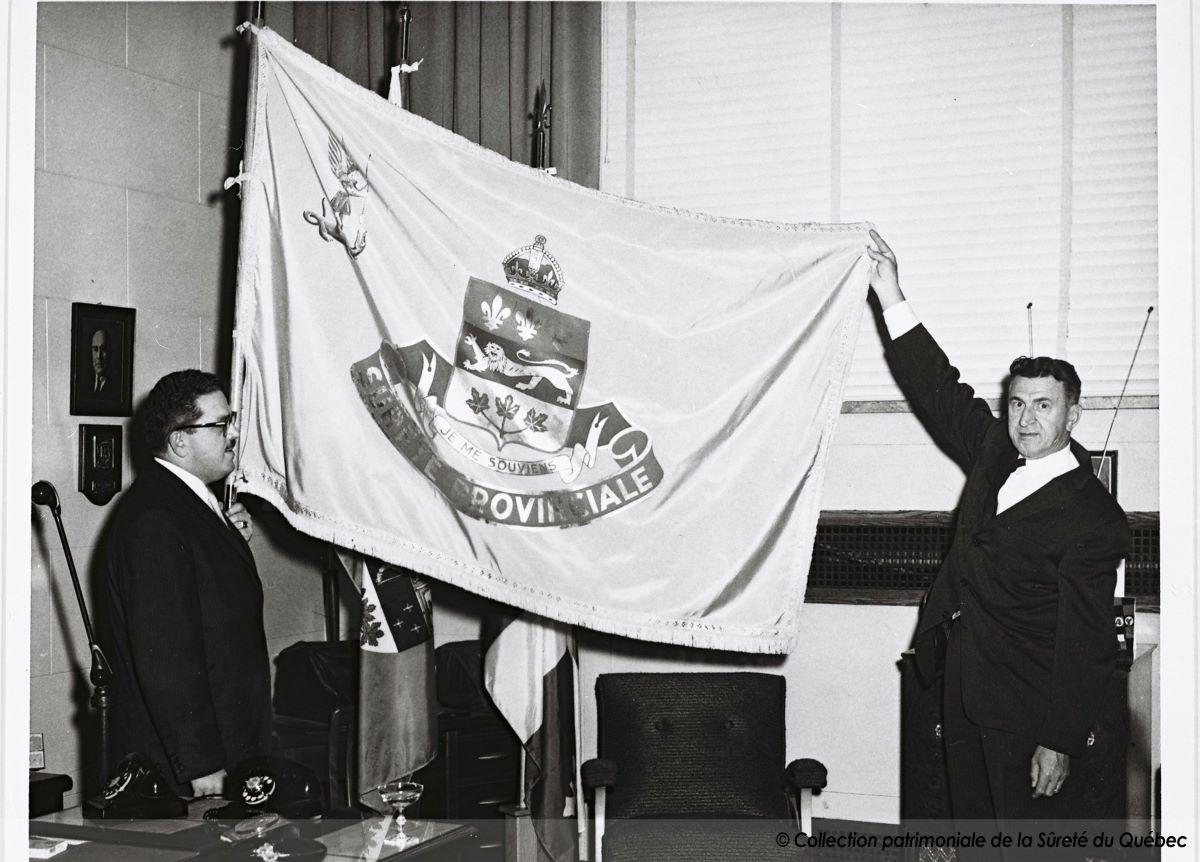Les officiers posent au côté du drapeau de la Sûreté du Québec arborant l’emblème de 1980 dans le cadre de l’assermentation d’un nouveau commandant.