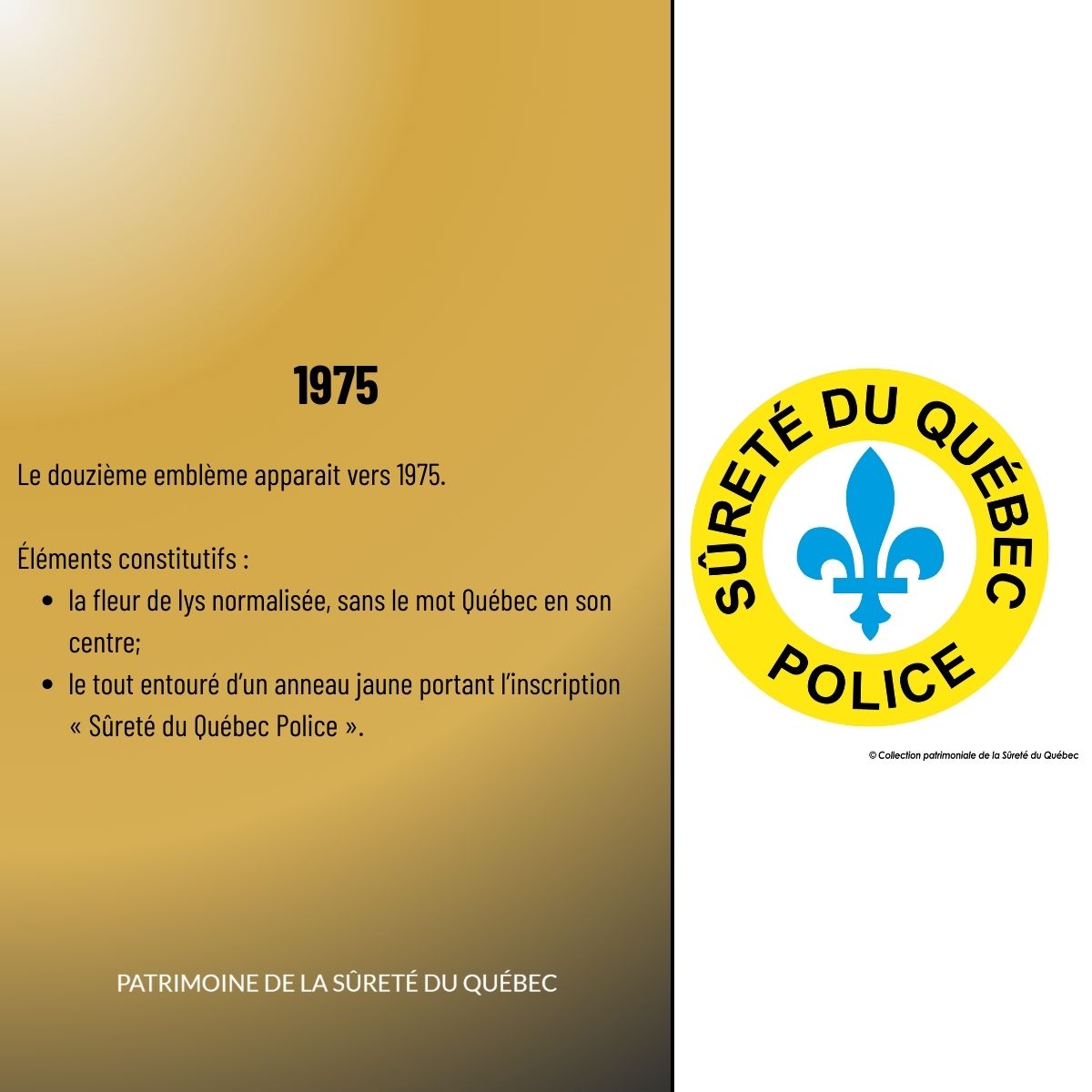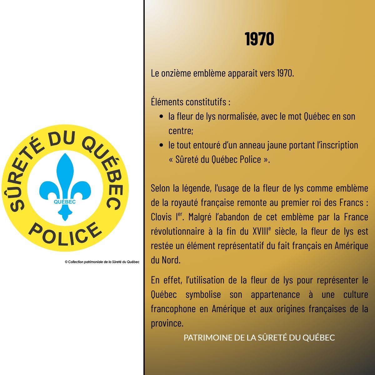 À partir des années 1970, les armoiries du Québec, symboles de l’affiliation au régime monarchique, sont remplacées par la fleur de lys, nouveau symbole fort du gouvernement et de la société québécoise. Ce changement provoque l’ajustement de l’emblème de la SQ selon l’évolution des normes d’identification visuelle du gouvernement du Québec durant cette décennie. On voit donc disparaître les armoiries du Québec ainsi que les branches de feuilles d’érable au profit de la fleur de lys.